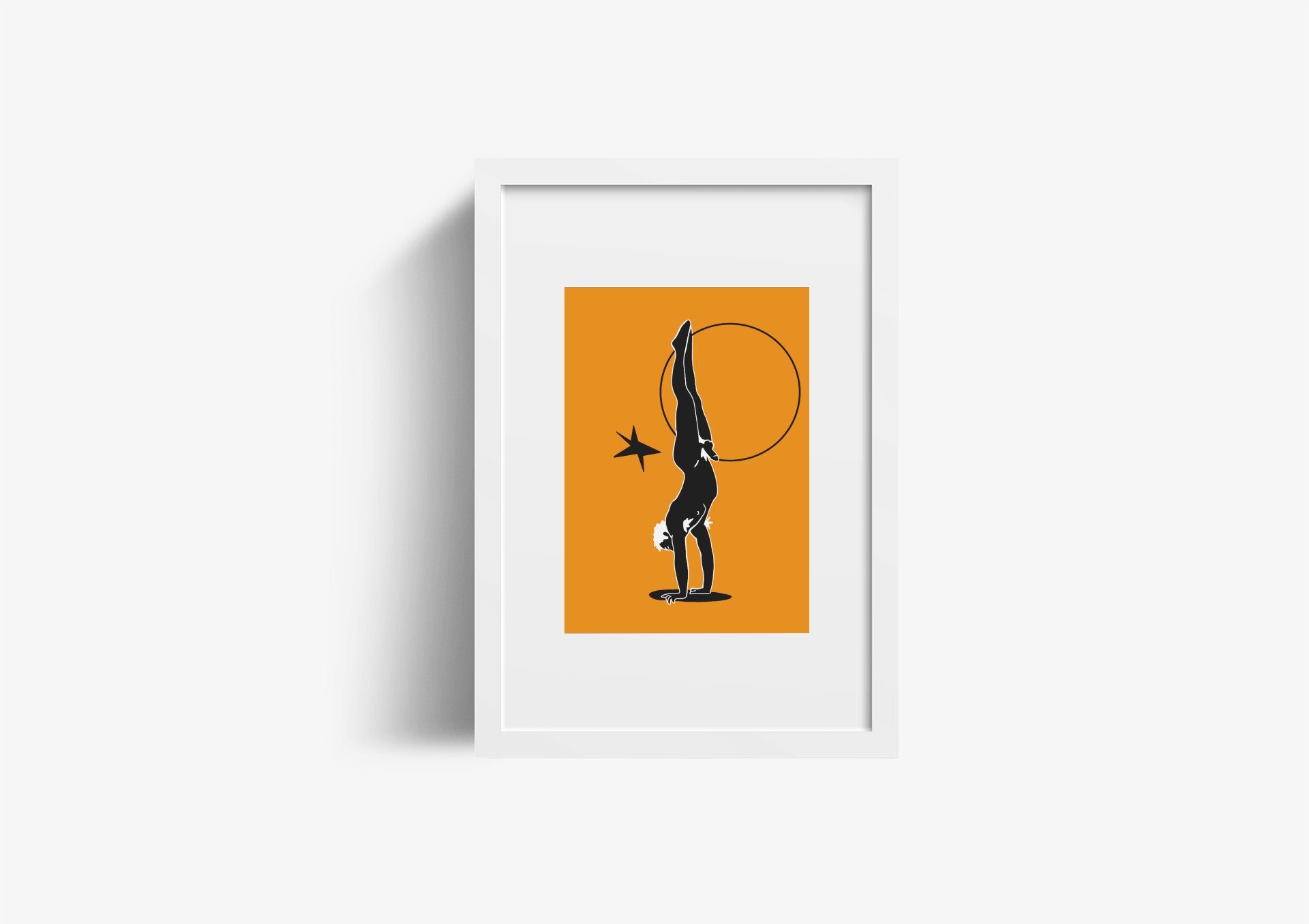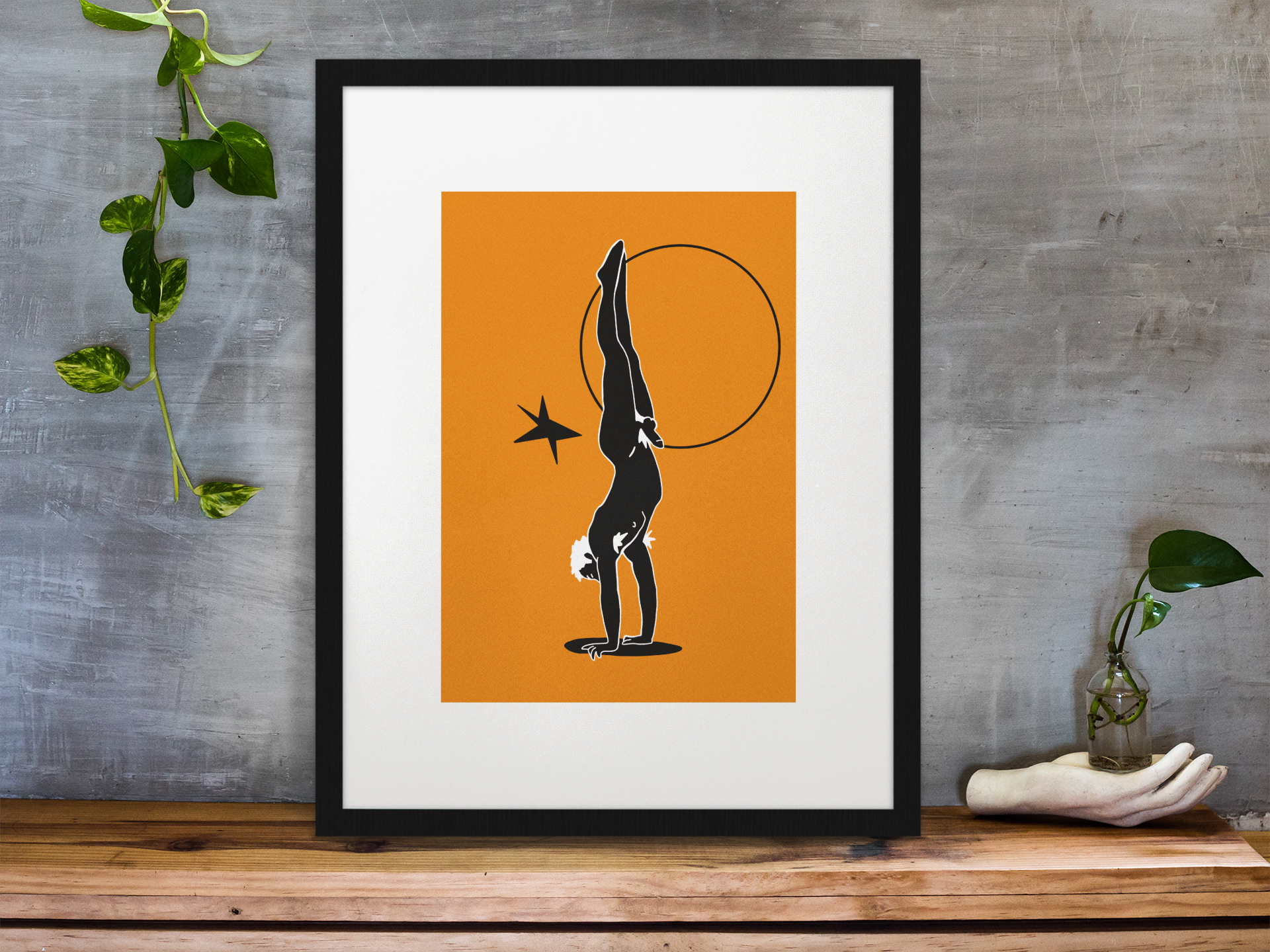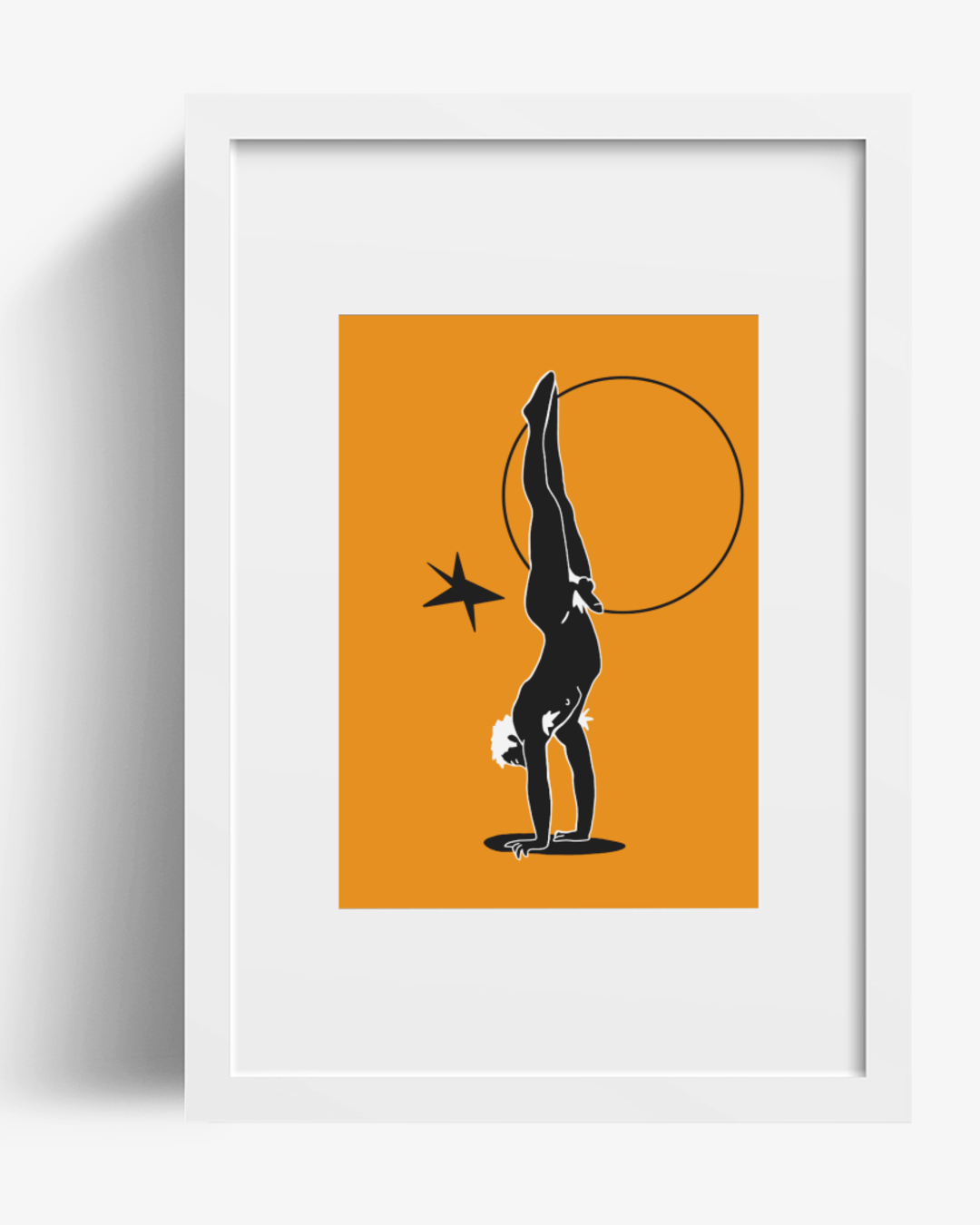 Ignite your space with “Balance of Fire: Orbit in Stillness,” a bold minimalist print that celebrates strength, sensuality, and cosmic harmony. Set against a vibrant amber backdrop, the central figure holds a flawless handstand, body elongated in powerful symmetry, while a delicate circular arc and a lone star evoke motion, gravity, and desire. This piece blends athletic grace with queer sensuality, capturing a moment suspended between earth and sky.
