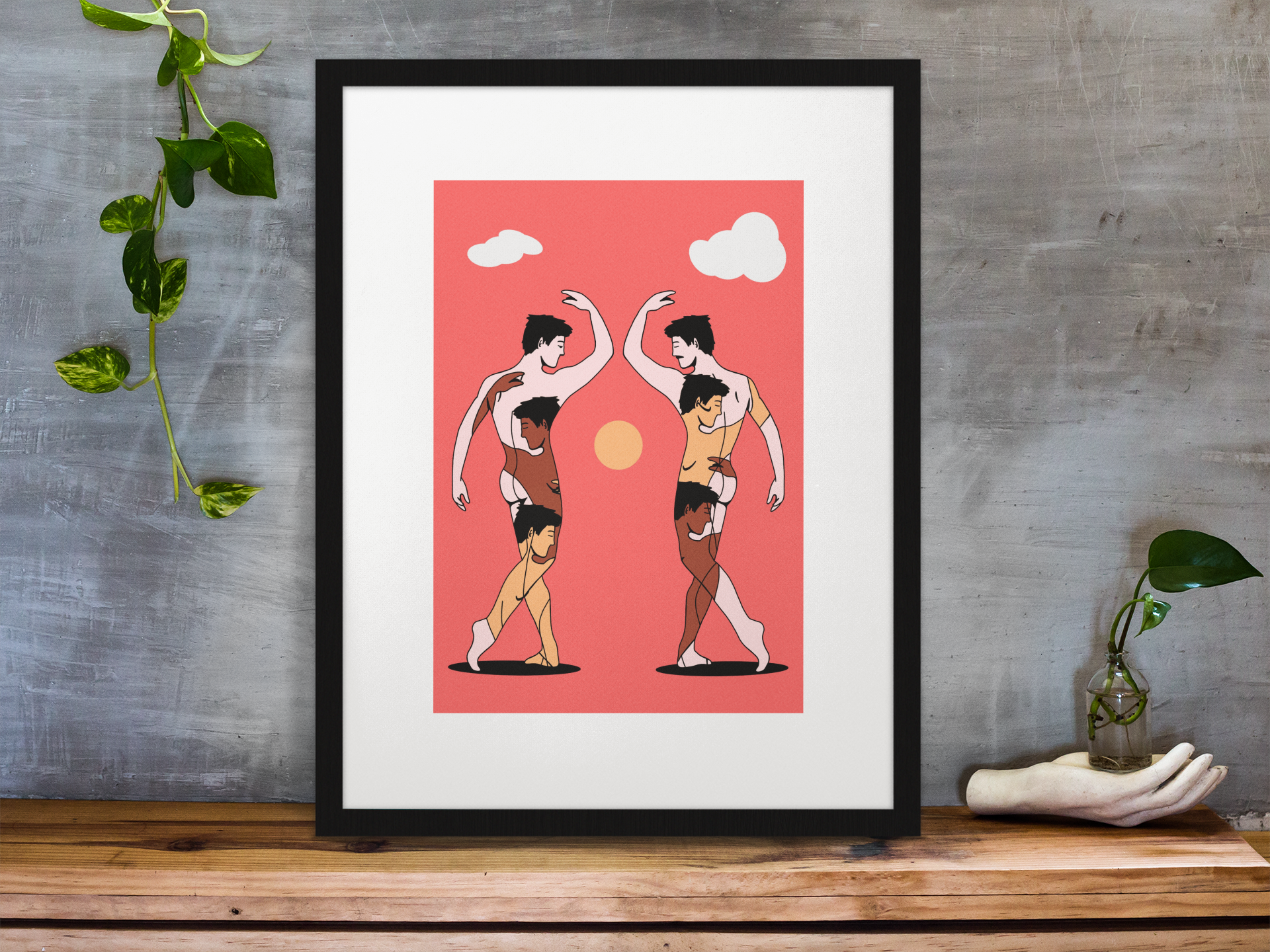 Bring warmth, balance, and heartfelt queer beauty into your home with this peaceful, modern illustration.