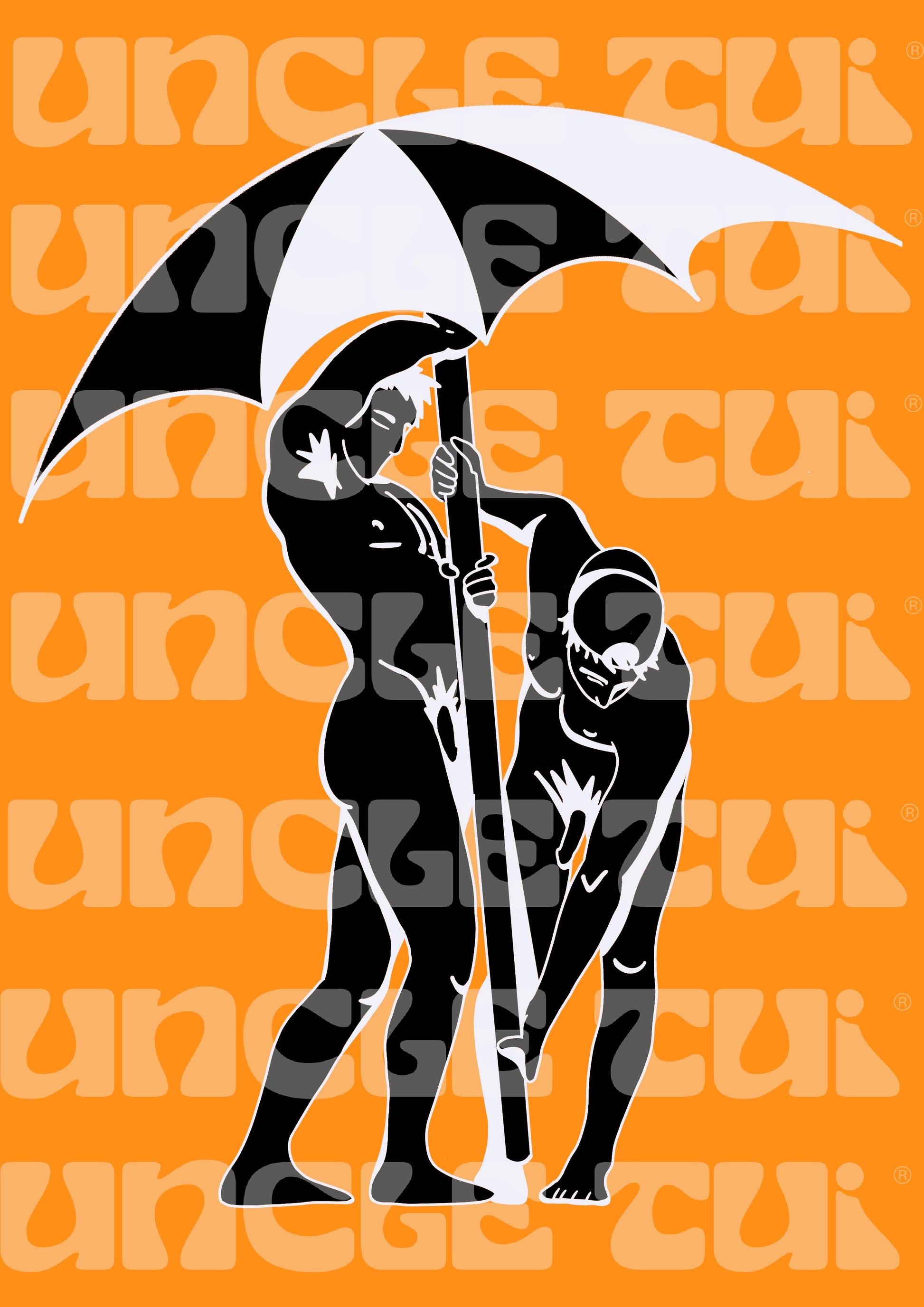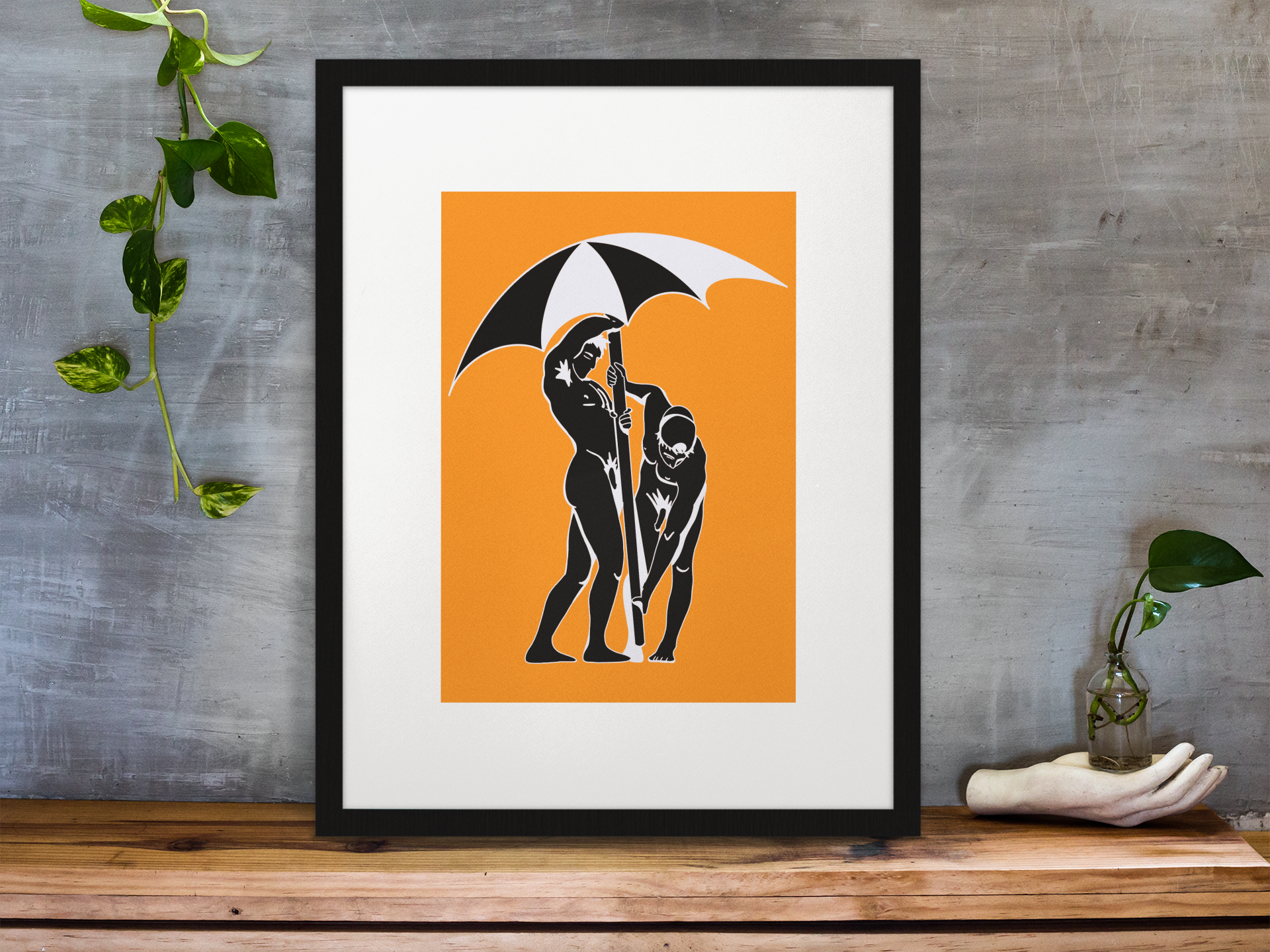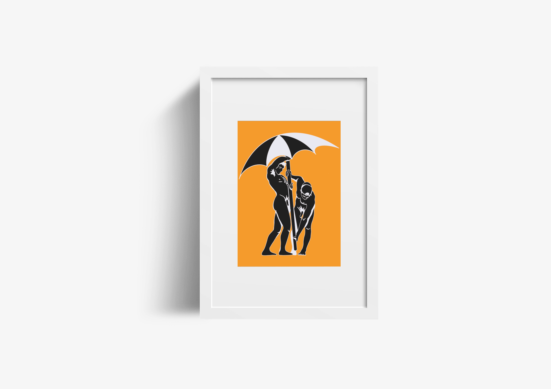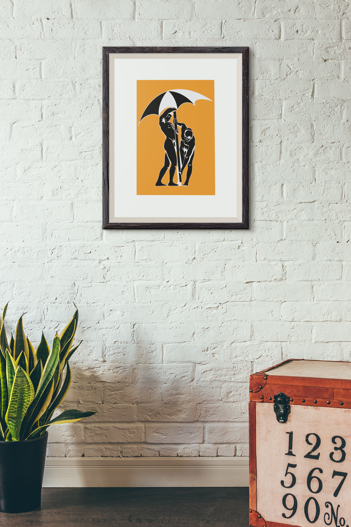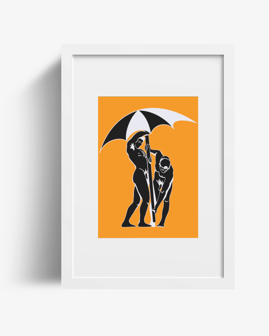 Warm, intimate, and quietly poetic, “Hanlan's Beach” captures a tender moment shared beneath a bold black-and-white umbrella. Set against a vibrant orange backdrop, two intertwined figures stand close—one offering shelter, the other leaning in with soft vulnerability. The minimalist silhouettes and subtle gestures create a scene filled with care, balance, and connection.