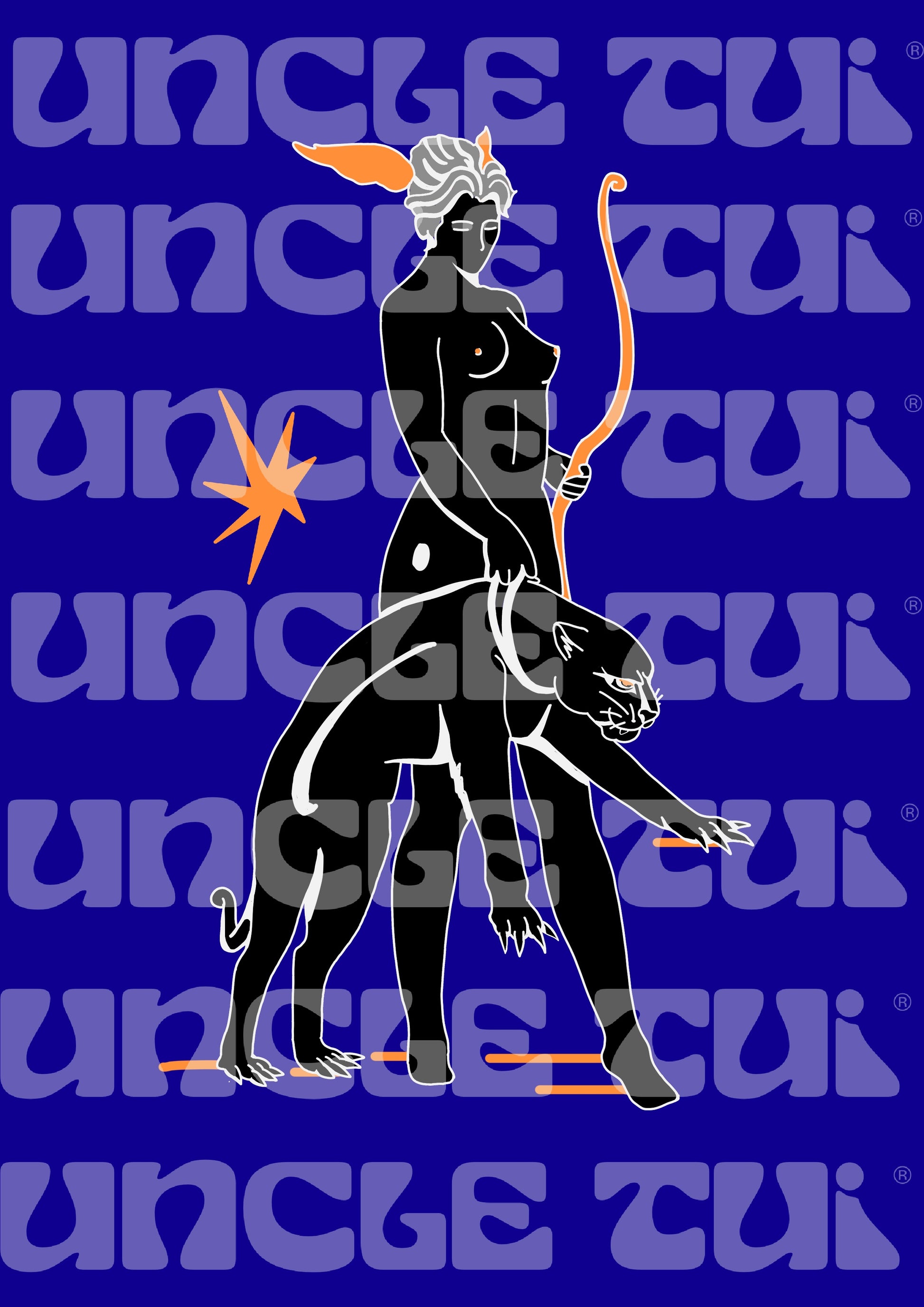 Elevate any space with "Huntress & Panther: Midnight Power," a bold, minimalist print fusing mythic strength and untamed artistry. Set against a deep cobalt blue, this piece features a striking huntress and her panther companion defined by radiant orange accents—embodying power, mystique, and liberated sensuality. Ideal for those who appreciate commanding imagery and contemporary mythic themes.