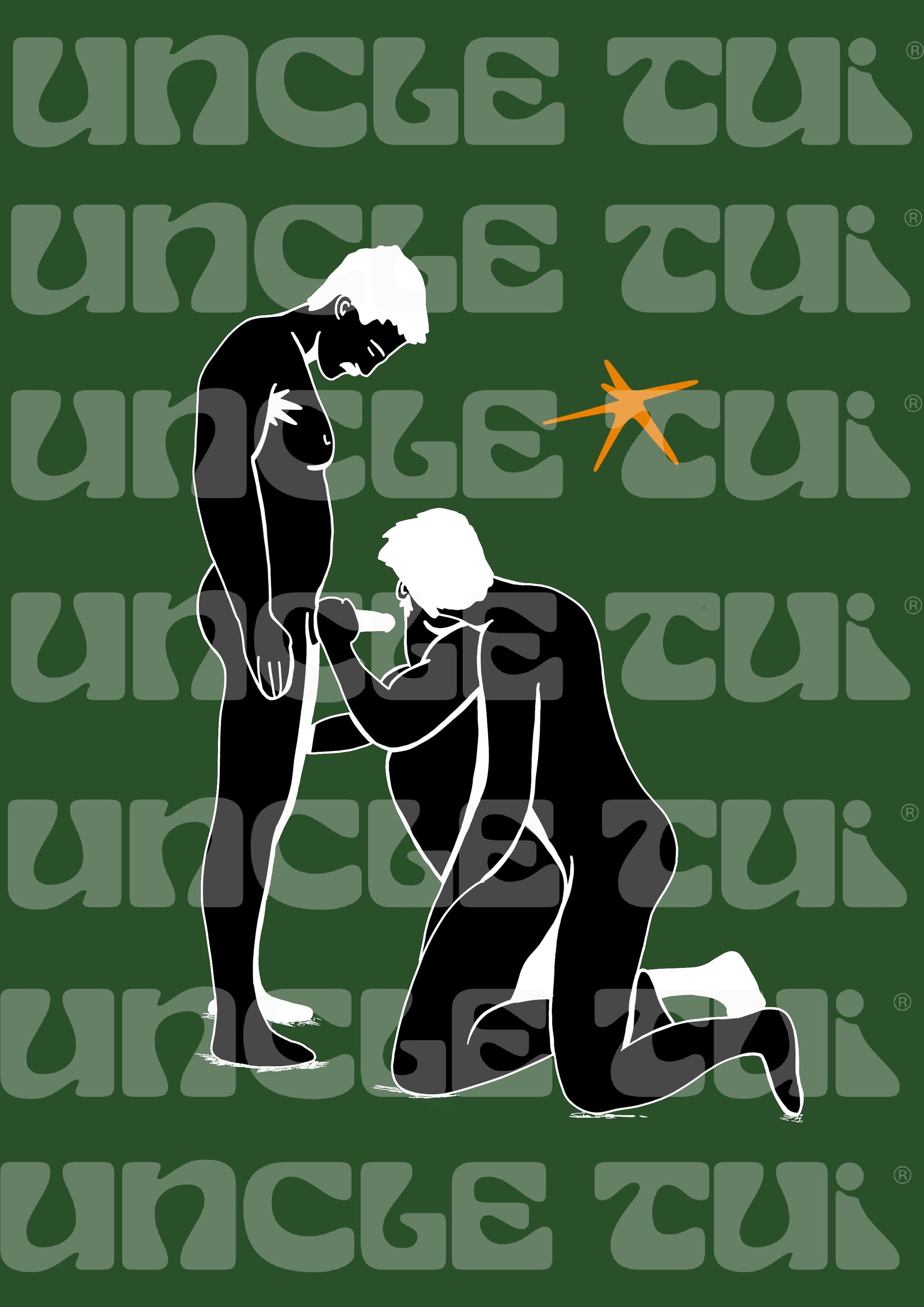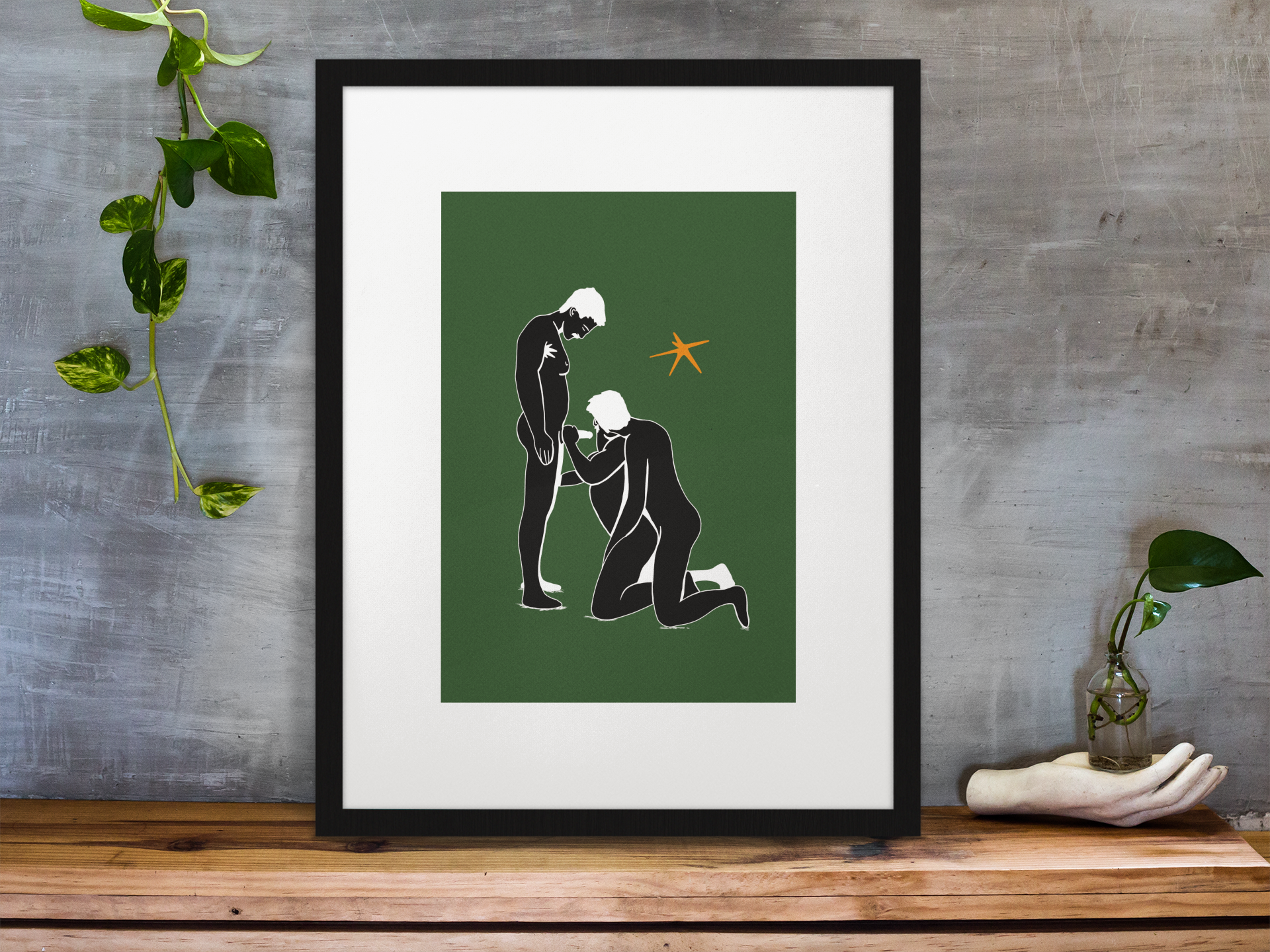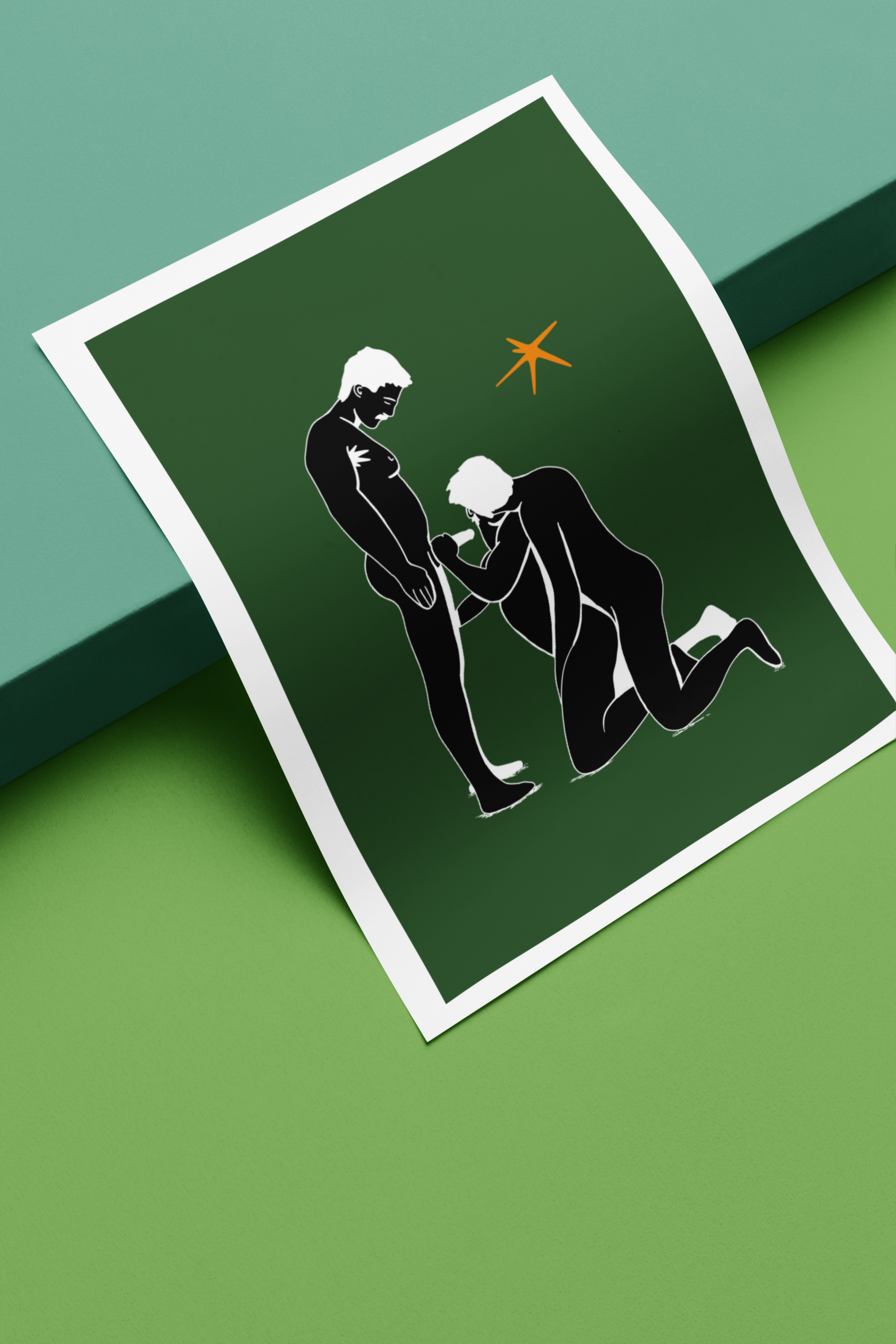 Elevate any space with "Offering: Devotion in Green," a bold, minimalist print capturing an intimate ritual of care and connection. Set against a deep green backdrop and touched by a bright orange star, this artwork depicts vulnerability, tenderness, and queer intimacy, making it a perfect piece for those who value narrative, emotional depth, and modern style.