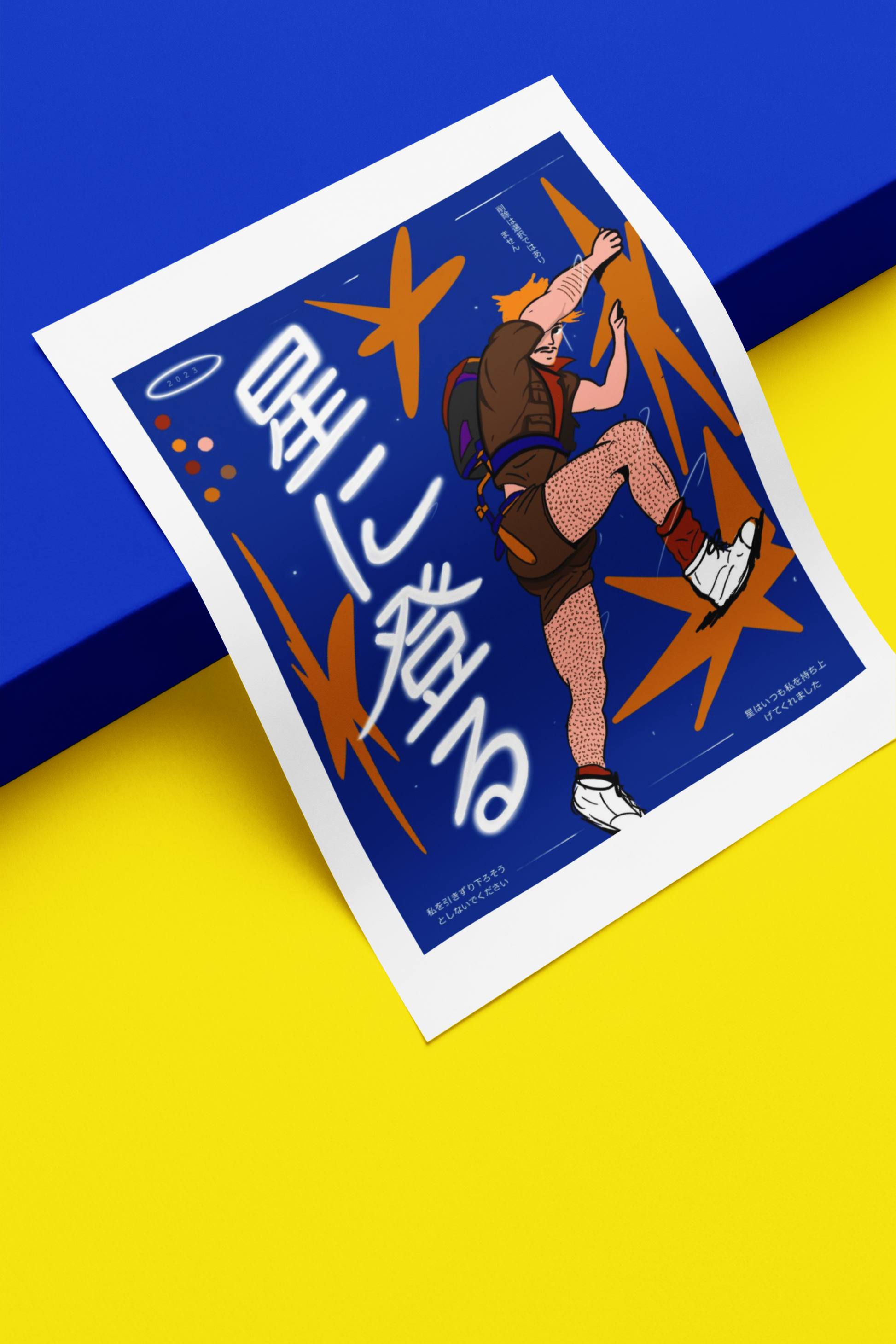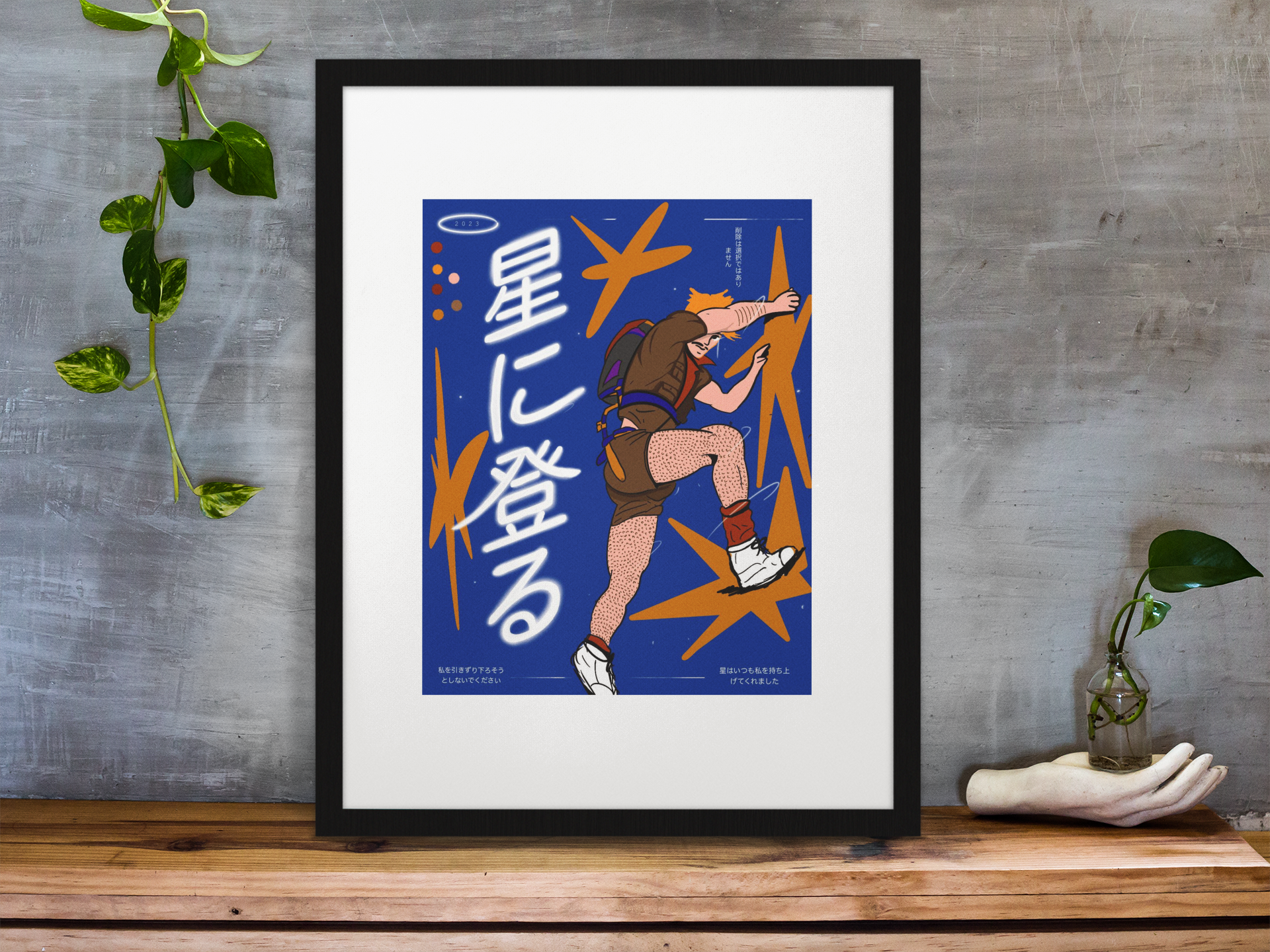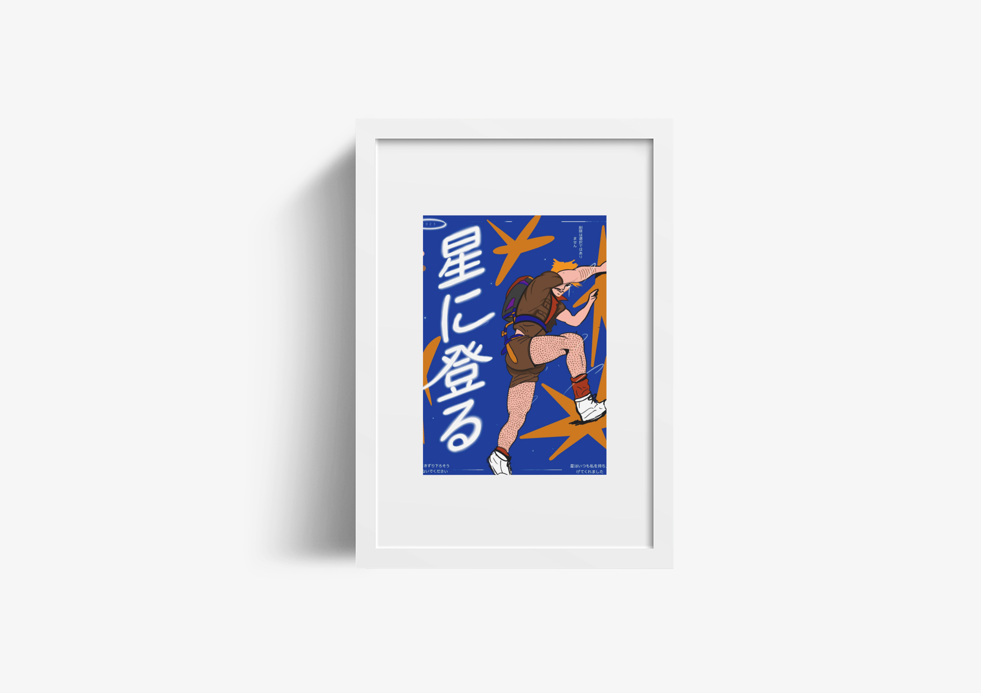 Elevate any space with "Climb to the Stars: 星に登る," a dynamic, pop-inspired print fusing bold Japanese typography, cosmic motifs, and an adventurous spirit. The central climber ascends amidst a constellation of orange stars, creating an atmosphere of ambition, movement, and quirky retro charm—ideal for modern interiors, creative studios, or collectors with a love of playful international flair.